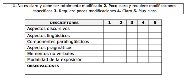 Se trata, pues, de una validación de contenido cuyos objetivos son analizar y valorar los descriptores del baremo inducido, así como comprobar si los ítems seleccionados miden todas las categorías o descriptores que se desea medir y que caracterizarán a la prueba de exposición oral académica.