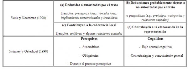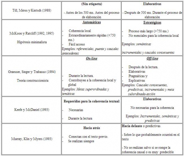 Desde esta perspectiva parece razonable pensar que estas inferencias pueden ser producidas durante la lectura (on-line) e incluyen aquellas inferencias relacionadas con las metas superordinadas de los personajes que motivan acciones explicitadas en el texto, las causales antecedentes que explican el por qué de una acción, y las inferencias temáticas globales que integran los principales argumentos en el texto. De este modo, las inferencias que se realizan durante el proceso de comprensión (on-line) incluirían, por un lado, aquellas que establecen la coherencia local como son las inferencias referenciales y las antecedentes causales y, por otro lado, también se incluirían aquellas que aseguran la coherencia global, como las inferencias que proporcionan la meta superordinada, las inferencias temáticas, o aquellas que ayudan a configurar la reacción emocional del personaje. Por su parte, entre las inferencias que se generan con posterioridad a la lectura (off-line) se encuentran las causales consecuentes, las pragmáticas, lasinstrumentales o las predictivas. Estas inferencias ofrecen un enriquecimiento ya que aportan información complementaria y precisa a lo que ya hemos leído y comprendido.