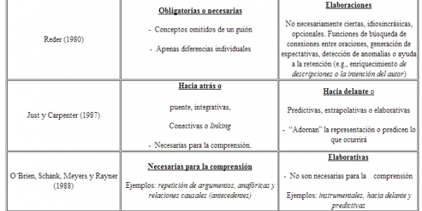 - Necesidad de o requisito para comprender: Se distingue entre inferencias denominadas necesarias uobligatorias, si la realización de la inferencia considerada contribuye decisivamente a la formación de un modelo mental adecuado, e inferencias elaborativas, si sólo sirve para “enriquecer” ese modelo mental (e.g., Clark y Haviland, 1976; Reder, 1980). Entre las inferencias necesarias para la comprensión, suelen incluirse las inferencias “puente”, la repetición de argumentos, las inferencias anafóricas y las antecedentes causales. Entre las inferencias no necesarias para la comprensión o elaborativas se incluyen las inferencias hacia delante o proactivas, las instrumentales y las predictivas.