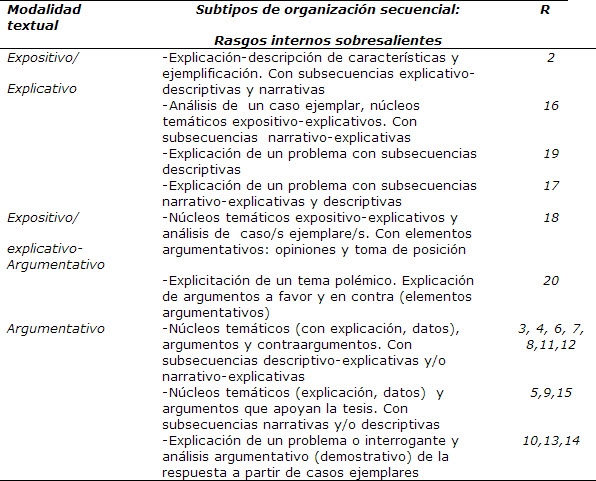 El análisis de ocurrencias en el corpus permite establecer qué categorías se identifican, cómo se manifiestan, cuáles son las más frecuentes - obligatorias u optativas- así como la forma en que éstas se combinan.