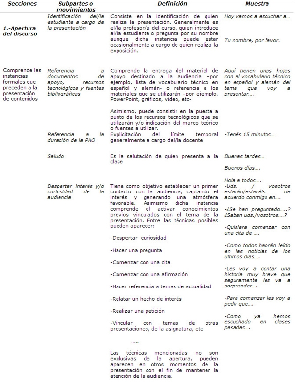 PAO: Sección 1. Apertura del discurso. Comprende las instancias formales que preceden a la presentación de contenidos propiamente dicha – identificarse, explicitar la duración de la exposición, referirse a los materiales de apoyo que se utilizarán- y constituye un primer contacto e interacción con la audiencia destinado a generar empatía, motivar y establecer una relación positiva con ésta –saludo, despertar interés y/o curiosidad-. Se trata de una sección de carácter optativo si bien algunos movimientos son esperables o deseables en una buena presentación oral –por ej. el saludo y el despertar el interés de la audiencia-