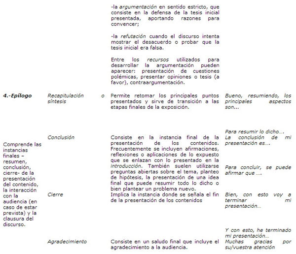 Después de analizar y de resumir los textos seleccionados, el alumno adapta el texto escrito al discurso oral, sabiendo que la macroestructura está inspirada en la retórica clásica. Un buen discurso tiene tres secciones diferenciadas: la introducción, el cuerpo del discurso y la conclusión (Sanz Àlava 2005:206-207).