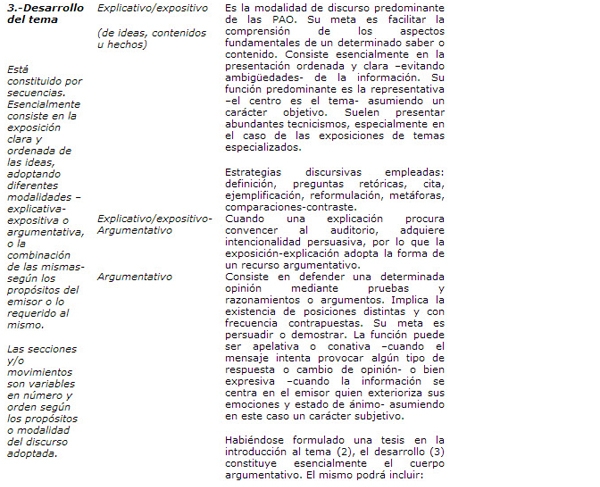 Y finalmente, Vázquez (2000) sitúa la pieza textual en cuestión dentro de los cursos de habilidades específicas afirmando que “…presentar un tema es una actividad compleja que supone, además del dominio lingüístico, un dominio discursivo, el manejo de ciertas técnicas elementales de retórica y una cierta seguridad personal” (Vázquez 2000:124).