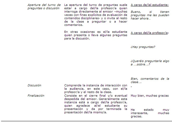 Debe advertirse que si bien se ha explicitado que la presentación oral pertenece a los géneros monologados, la misma suele incluir la interacción oral entre los participantes del discurso, ya que generalmente contempla un turno de preguntas luego de la exposición[5], lo que le asigna también un carácter dialogado a la misma.