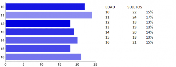 La edad y sexo de los participantes se distribuyen de forma homogénea como indican los dos siguientes gráficos (figuras 1 y 2); no obstante, la variable sexo no se ha tenido en cuenta en el análisis de los resultados.