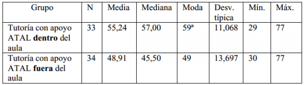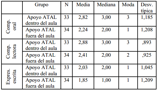 Además, la prueba U de Mann-Whitney revela que existen diferencias estadísticamente significativas que confirma el beneficio del apoyo ATAL en un contexto inclusivo al alumnado cuya lengua materna no es el español, y un mayor beneficio cuando este apoyo se realiza dentro del aula de referencia, tal como indica la siguiente tabla (tabla 4).