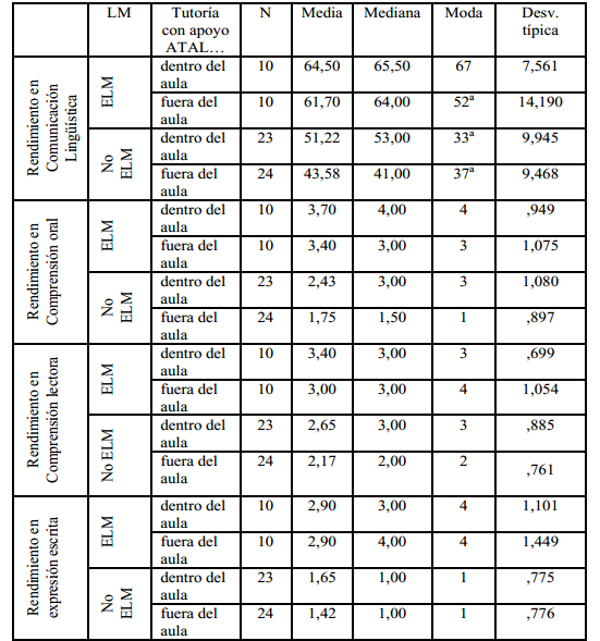Tabla 4. Rendimiento en la Prueba de competencias básicas en Comunicación lingüística en función de la lengua materna del alumnado y la modalidad de apoyo ATAL de su grupo.