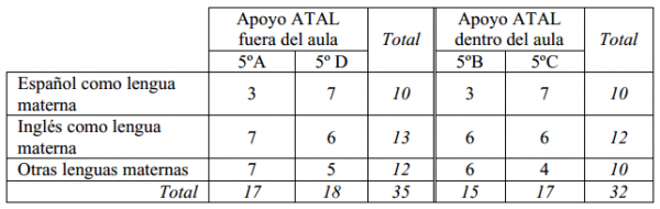 Tabla 1. Distribución del alumnado participante según su lengua materna, curso y tipo de apoyo ATAL que se practicaba en el mismo