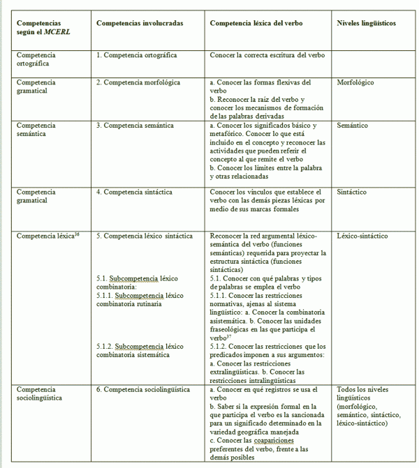 This work aims to make a contribution to the structure and to the possibilities of a systematic analysis of the lexical component by examining a specific category, the verb. To do this, it combines the proposals contained in the Common European Framework for Languages with specific methodological approaches concerning to the lexical knowledge. This results in a formalized proposal of the features that constitute the lexical competence of the verb. These features are grouped into morphological, semantic (also including paradigmatic and syntagmatic relations), lexical-syntactic and sociolinguistic areas. This proposal is designed to be useful for interlanguage studies, in which lexical knowledge in general, and the verb, in particular, play a key role.