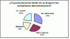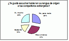 Del análisis de los datos resulta que las actitudes de los autóctonos[10] son, en general, positivas, aunque se refleja cierto rechazo específicamente en las actitudes lingüísticas. En efecto, más de la mitad de la muestra (59%) no aprueba el uso de la lengua materna por parte de los compañeros extranjeros, dado que les impide participar en las conversaciones con ellos, obstaculiza su integración en el país en el que viven, perciben su uso como una falta de respeto hacia los demás compañeros, además de que se ven indefensos frente a posibles insultos o burlas. Sin embargo, aunque en menor proporción, no faltan los que aprecian las otras lenguas, pues las consideran agradables, las pueden aprender o el simple hecho de conocerlas les permite acercarse a otras culturas.
