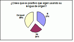 Algo más de 1/3 de la muestra está a favor del mantenimiento de la LM, sobre todo porque reconocen que es una manera de no perder las raíces, además de los beneficios que implica dominar más de un idioma. El resto, en cambio, o se muestra indiferente (39%) o bien se opone totalmente (24%) por causas que ya han emergido anteriormente: la falta de respeto al país que los acoge, un obstáculo para la integración y un impedimento para el aprendizaje del italiano.