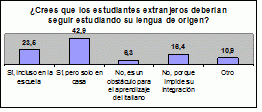 Casi un tercio de la muestra (22,7%) se opone rotundamente a que los compañeros extranjeros sigan estudiando su lengua de origen, mientras que 2/3 están a favor de que sigan estudiándola, aunque solo en los hogares y con personas pertenecientes a su mismo grupo étnico. Una minoría estaría incluso de acuerdo en instituir el estudio del español como asignatura curricular. Sin embargo, en las escuelas el estudio de las lenguas de los alumnos extranjeros no está muy promovida y solo el 26,1% afirma que en el colegio se organizan cursos extracurriculares.