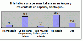 Algo más de la mitad de la muestra manifiesta una buena relación con la propia lengua, es decir, que no se avergüenza por revelar su origen a través de su forma de hablar en italiano, si su pronunciación o entonación deja traslucir su procedencia hispánica y latinoamericana. Sienten orgullo y alegría por poder hablarla con personas del lugar, dado que no solo facilita la comunicación y permite un intercambio cultural, sino que también pone en evidencia el valor que el español tiene en el nuevo contexto: