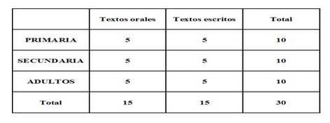 Se ha trabajado a partir del corpus de textos producidos por quince sujetos de origen marroquí pertenecientes a tres grupos de edad: cinco son estudiantes de cuarto curso de Primaria (9-10 años), cinco son estudiantes de primer curso de Educación Secundaria Obligatoria (12-13 años) y cinco son adultos que han cursado estudios universitarios, finalizados o no (entre 18 y 40 años). La lengua materna de los participantes es el dialecto marroquí del árabe familiar (dariya), una lengua fundamentalmente oral cuya escritura no se ha normalizado. Todos tienen el español como L2 y han residido en territorio español un mínimo de dos años, en Murcia, los de primaria y ESO, y en Madrid y Barcelona, los adultos.