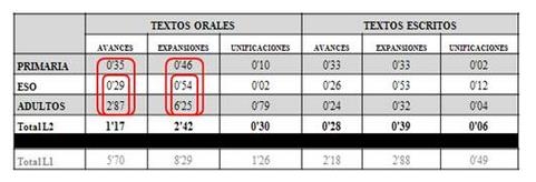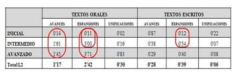 Respecto a la modalidad de producción, es la oral la que cuenta con producciones más extensas en todos los grupos, la que permite apreciar diferencias significativas entre los diferentes grupos. Los resultados corroboran que existen diferencias significativas en español L2 en los movimientos de avance y de expansión en la modalidad oral entre los grupos más jóvenes (primaria y ESO) y los adultos.
