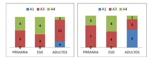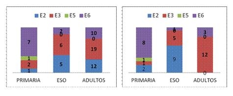 Como podemos observar, en el grupo de Primaria se da una clara preferencia por el subtipo E6, que se manifiesta en valoraciones y enunciados en tono normativo (15 y 16). Podemos encontrar ejemplos de este subtipo también en los grupos de ESO y de adultos, pero existen diferencias cualitativas en la manera de expresar estas ideas. Las prescripciones disminuyen con la edad, y cuando hay algún enunciado normativo o valoraciones, el grupo de adultos tiende a matizarlas, a justificarlas o/y a mostrarse más abiertos a aceptar otras opiniones (17 y 18).