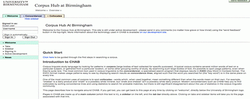 Various corpus interfaces are available for members of the UoB, including the BoE and the Corpus Hub at Birmingham (CHAB) [3]. In particular, CHAB is a collection of software tools made available under open source licenses. CHAB consists of various components, including a web-based concordancer called the Birmingham Concordancer [4], a search engine that powers the concordancer and a collection of corpora that supply the search engine [5], and a set of tools that compile the corpora (i.e., the SCAn Toolkit) [6].