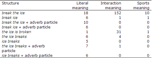 Moon also scrutinized the figures for polysemous senses of a particular FEI. For instance, the FEI break the ice has two idiomatic meanings: disperse awkwardness in social interaction (189 tokens) and, in the sports contexts, score for the first time in a game or season (12 tokens). Since Table 1 only presents the overall picture for the lemma break occurring within a five-word window of ice, with no further syntagmatic restrictions, Moon also highlighted the different ratios in the detailed structures of this FEI.